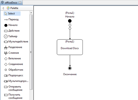 Для создания процесса officeDocx используем язык JPDL. Выбирая элементы палитры: “Начало”, “Окончание”, “Узел-действие”, “Переход” нарисуем следующий граф бизнес-процесса:
