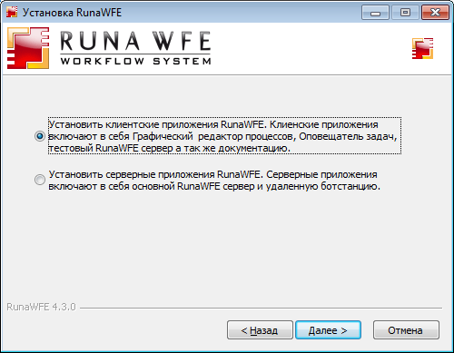 После утвердительного ответа на вопрос о принятии условий лицензии появится выбор – что установить на компьютер: клиентские или серверные компоненты RunaWFE: