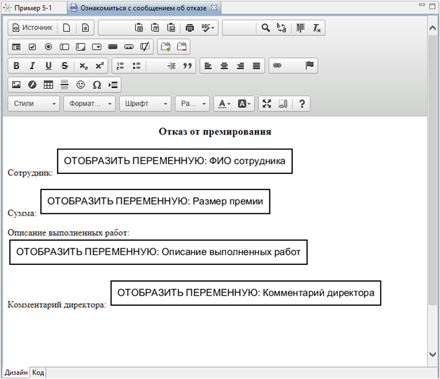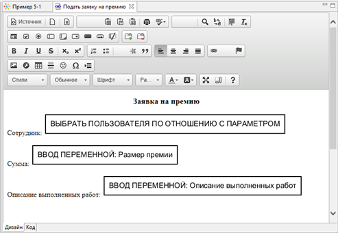 Напротив строки "Сумма" расположите компонент для ввода переменной "Размер премии" (см. Рис.2.10). Также разместите компонент для ввода переменной "Описание выполненных работ".