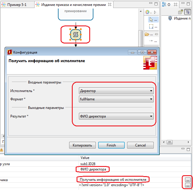 Замечание. Роль "Руководитель" инициализируется в стартовом узле бизнес-процесса сотрудником, запустившим этот экземпляр бизнес-процесса. Но для получения ожидаемого в примере результата предполагаем, что процесс будет запускать Паучков.