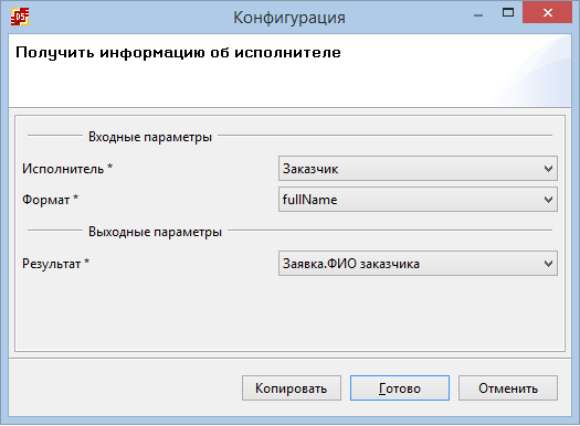 Замечание. В качестве результата всегда возвращает список, даже если был получен только один элемент. Именно поэтому в процессе "Заявка", после чтения заявки по ее id, дополнительно используется обработчик "Получить элемент списка".
