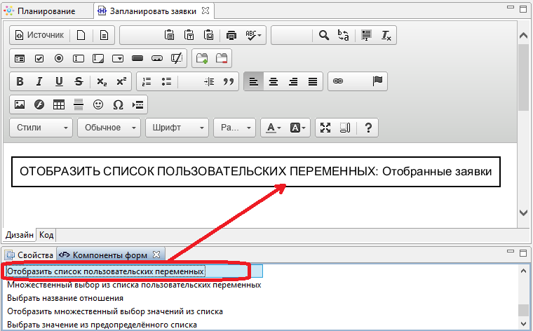 - Создайте форму для узла "Запланировать заявки". Расположите на форме компонент "Отобразить список пользовательских переменных". Используйте для этого двойной щелчок по компоненту из палитры.