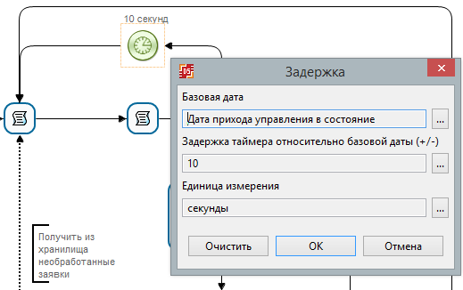 - Задайте задержку для Таймера. В процессе "Заявка" используется таймер для установки периода считывания заявки из внутреннего хранилища. Щёлкните по таймеру правой кнопкой мыши и выберите пункт "Задержка".