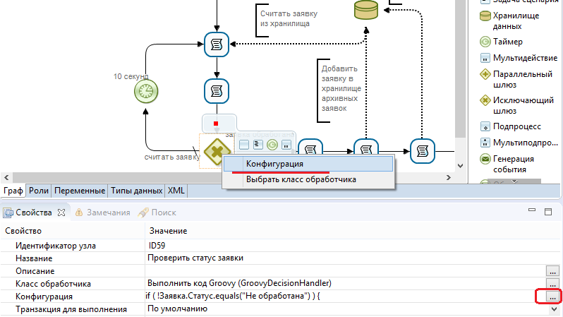 - Добавьте конфигурацию исключающего шлюза. В цикле опроса заявки с проверкой на предмет изменения ее статуса используется исключающий шлюз. Вызовите конструктор. Для этого щёлкните правой кнопкой мыши по элементу и выберите пункт "Конфигурация". Это же можно сделать и через свойства элемента.
