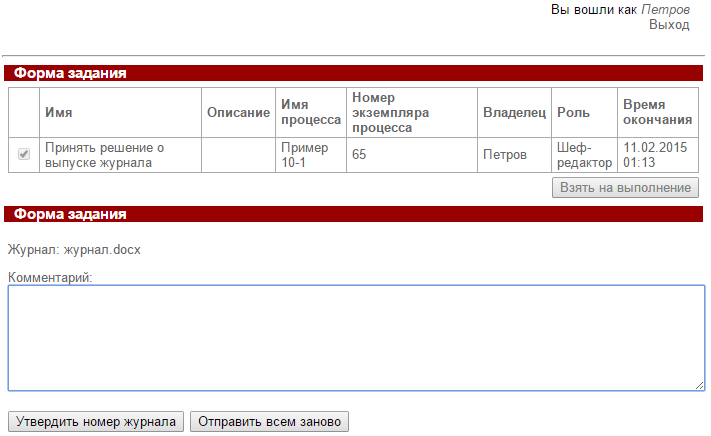 Шеф-редактор "Петров" получит задание "Принять решение о выпуске журнала", в форме задания доступна ссылка на docx файл журнала, а также текстовое поле для ввода комментария, который в обязательном порядке необходим в случае если шеф-редактор решит отправить журнал на доработку.