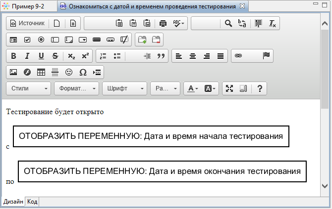 - Дата и время окончания тестирования - переменная формата "Дата со временем", определяется в обработчике "Выполнить формулу" задачи-сценария "Определение даты и времени окончания тестирования"