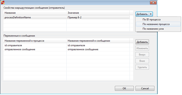 - "id отправителя", это переменная формата "Строка", содержит id экземпляра процесса "Пример 8-1". Принимает значение из сообщения, и необходима для определения получателя, т.е. используется в свойствах маршрутизации.