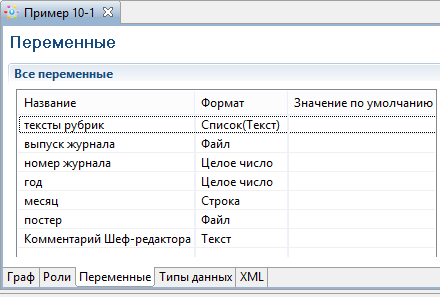 - Создайте переменные. В процессе "Пример 8-1" используются следующие переменные: