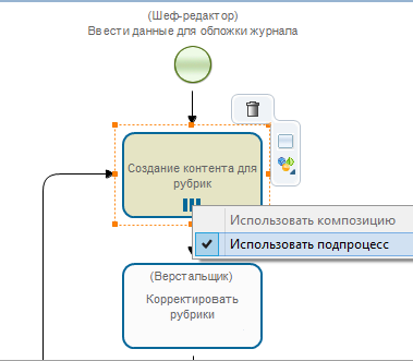 В практическом занятии "Работа с мульти-подпроцессами", мульти-подпроцесс для создания контента рубрик, запускался по группе «Редакторы». В самостоятельной же работе необходимо реализовать запуск мульти-подпроцесса по обратному отношению «Шеф-Редактор», примененному к пользователю, запустившему экземпляр бизнес-процесса. То есть, мульти-подпроцесс должен быть запущен по тем редакторам, для которых запустивший бизнес-процесс является шеф-редактором.