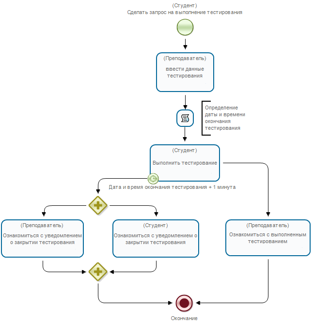 - Длительность тестирования - переменная формата "Целое число", вводится Преподавателем в узле "Ввести данные тестирования".