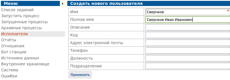 - Создайте учетные записи пользователей «Сверчков» и «Паучков». Для создания учетной записи «Сверчков» откройте интерфейс «Исполнители» и выберите ссылку «Создать пользователя». Откроется форма для ввода данных пользователя (Рис.4.05). В поле «Имя» введите «Сверчков», в поле «Полное имя» введите «Сверчков Иван Иванович», остальные поля заполнять необязательно.