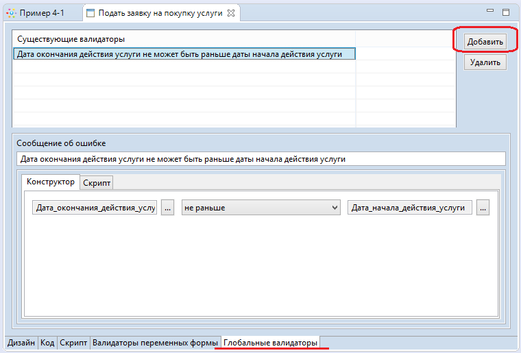 Перейдите на вкладку "Глобальные валидаторы", щёлкните "Добавить", в поле ввода сообщения об ошибке вставьте "Дата окончания действия услуги не может быть раньше даты начала действия услуги".