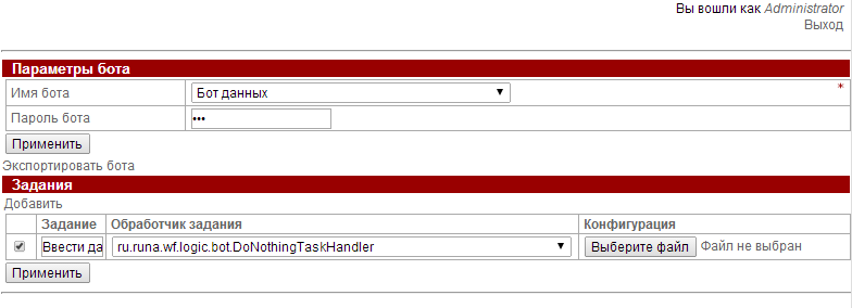 Замечание. С бот станцией должен быть связан один из пользователей. От имени этого пользователя бот станция будет обращаться к RunaWFE серверу для того, чтобы прочитать свои параметры. Логин и пароль этого пользователя вводится в специальном конфигурационном файле (botstation.properties). По умолчанию в системе в качестве пользователя с правами на работу с бот станцией указан Administrator.